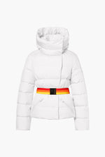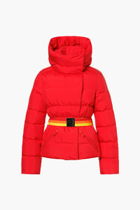 Quilted down jacket with hood and elastic belt