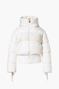 Quilted down bomber jacket with hood and fringes